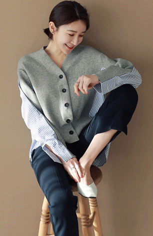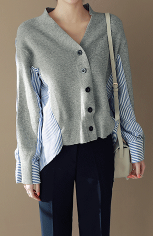 異素材MIX Vネック ニットカーディガン レディース ストライプシャツ 体型カバー ウール混紡 華奢見え 服装 春 秋 ドロップショルダー ニットカーデ トップス 韓国 ファッション 長袖 カーデ 羽織り 上着 ベーシック シンプル レイヤード アウター ライトアウター